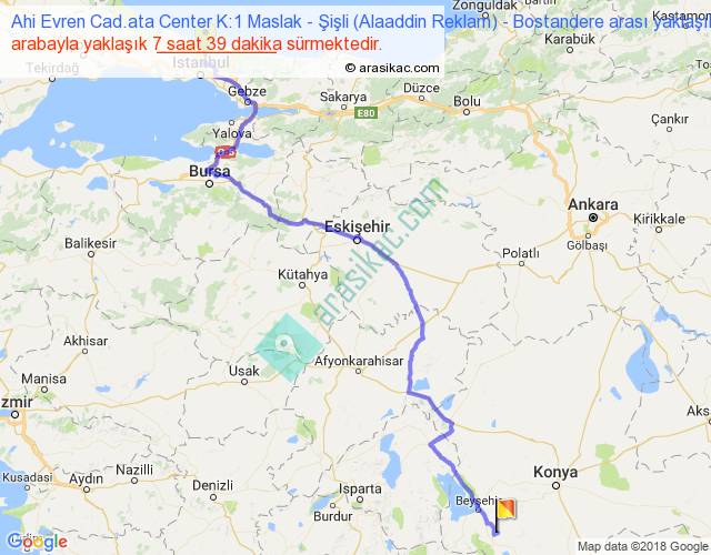 Ahi Evren Cad.ata Center K:1 Maslak - Şişli (Alaaddin Reklam) - Bostandere arası yaklaşık olarak 90 km/h ile yukarıda belirtilen sürede olup, iki yerin kuş uçuşu uzaklığı (mesafesi) 469'dir. Eğer belirtilen yerler arasında uçak seferi var ise bu süre uçakla 43 dakika'ya kadar düşebilir. Yolculuk otobüsle 9 saat 56 dakika sürmektedir.