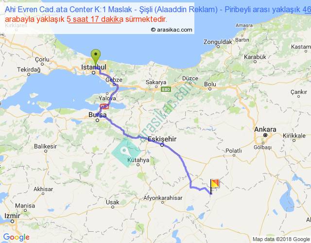 Ahi Evren Cad.ata Center K:1 Maslak - Şişli (Alaaddin Reklam) - Piribeyli arası yaklaşık olarak 90 km/h ile yukarıda belirtilen sürede olup, iki yerin kuş uçuşu uzaklığı (mesafesi) 329'dir. Eğer belirtilen yerler arasında uçak seferi var ise bu süre uçakla 30 dakika'ya kadar düşebilir. Yolculuk otobüsle 6 saat 52 dakika sürmektedir.