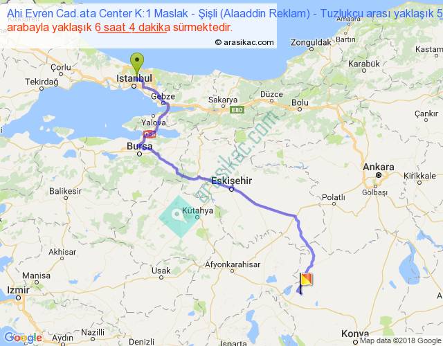 Ahi Evren Cad.ata Center K:1 Maslak - Şişli (Alaaddin Reklam) - Tuzlukçu arası yaklaşık olarak 90 km/h ile yukarıda belirtilen sürede olup, iki yerin kuş uçuşu uzaklığı (mesafesi) 366'dir. Eğer belirtilen yerler arasında uçak seferi var ise bu süre uçakla 33 dakika'ya kadar düşebilir. Yolculuk otobüsle 7 saat 53 dakika sürmektedir.