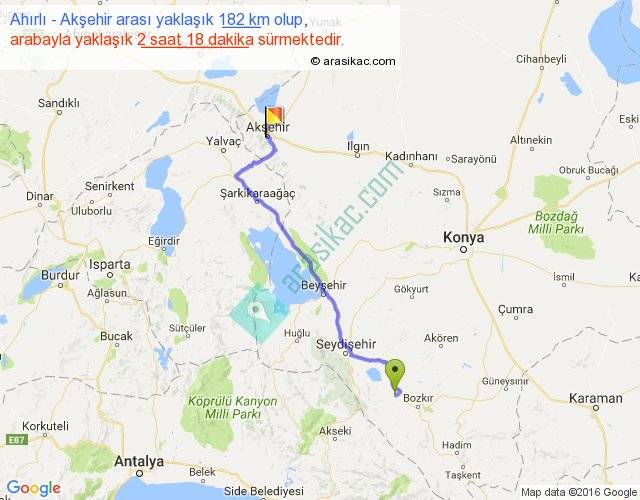 Ahırlı - Akşehir arası yaklaşık olarak 90 km/h ile yukarıda belirtilen sürede olup, iki yerin kuş uçuşu uzaklığı (mesafesi) 138'dir. Yolculuk otobüsle 2 saat 59 dakika sürmektedir.