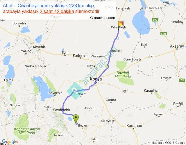 Ahırlı - Cihanbeyli arası yaklaşık olarak 90 km/h ile yukarıda belirtilen sürede olup, iki yerin kuş uçuşu uzaklığı (mesafesi) 172'dir. Yolculuk otobüsle 3 saat 30 dakika sürmektedir.