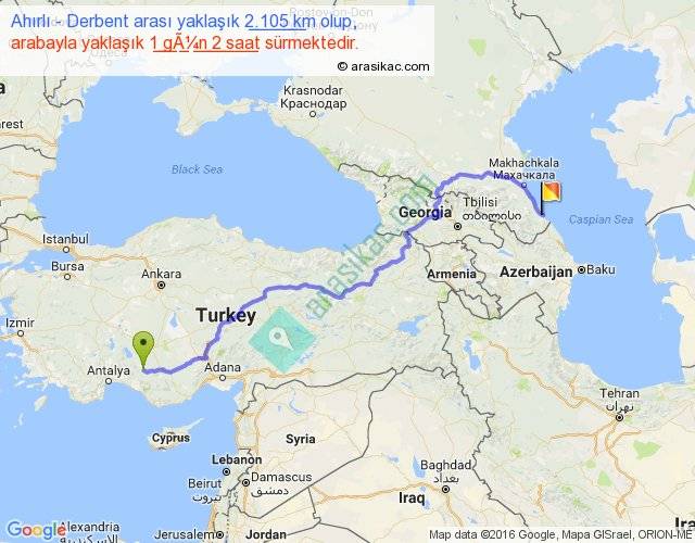 Ahırlı - Derbent arası yaklaşık olarak 90 km/h ile yukarıda belirtilen sürede olup, iki yerin kuş uçuşu uzaklığı (mesafesi) 1473'dir. Eğer belirtilen yerler arasında uçak seferi var ise bu süre uçakla 2 saat 15 dakika'ya kadar düşebilir. Yolculuk otobüsle 1 gün 9 saat sürmektedir.