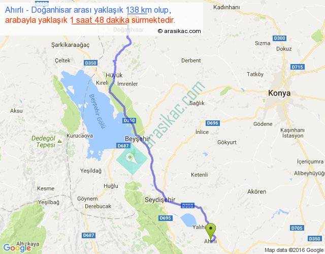 Ahırlı - Doğanhisar arası yaklaşık olarak 90 km/h ile yukarıda belirtilen sürede olup, iki yerin kuş uçuşu uzaklığı (mesafesi) 108'dir. Yolculuk otobüsle 2 saat 20 dakika sürmektedir.