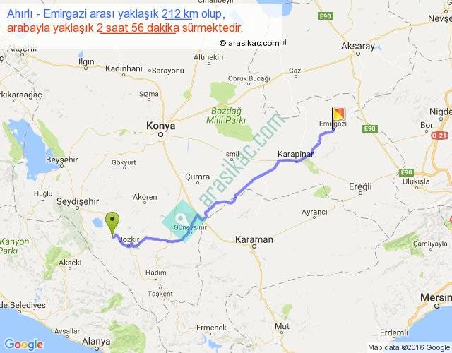 Ahırlı - Emirgazi arası yaklaşık olarak 90 km/h ile yukarıda belirtilen sürede olup, iki yerin kuş uçuşu uzaklığı (mesafesi) 167'dir. Yolculuk otobüsle 3 saat 48 dakika sürmektedir.