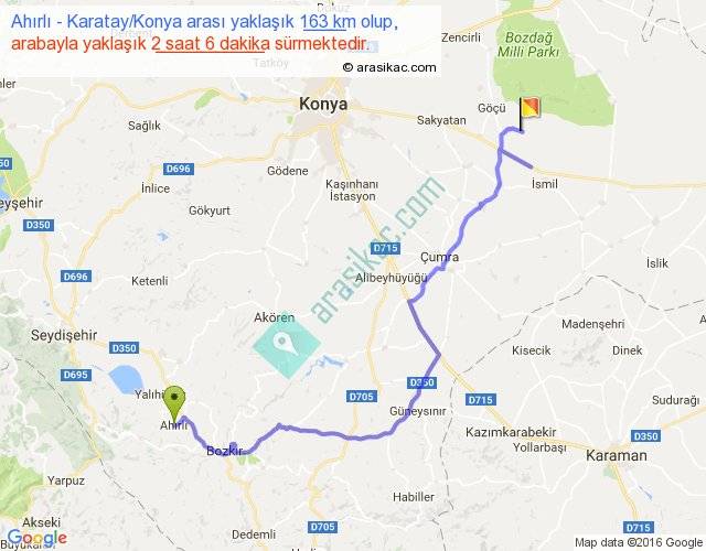 Ahırlı - Karatay Konya arası yaklaşık olarak 90 km/h ile yukarıda belirtilen sürede olup, iki yerin kuş uçuşu uzaklığı (mesafesi) 99'dir. Yolculuk otobüsle 2 saat 43 dakika sürmektedir.