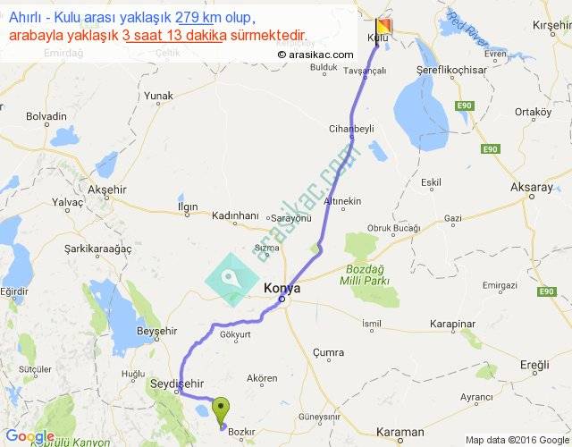 Ahırlı - Kulu arası yaklaşık olarak 90 km/h ile yukarıda belirtilen sürede olup, iki yerin kuş uçuşu uzaklığı (mesafesi) 221'dir. Yolculuk otobüsle 4 saat 10 dakika sürmektedir.