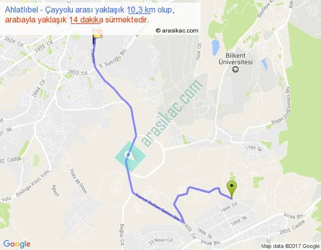 Ahlatlıbel - Çayyolu arası yaklaşık olarak 90 km/h ile yukarıda belirtilen sürede olup, iki yerin kuş uçuşu uzaklığı (mesafesi) 6'dir. Yolculuk otobüsle 18 dakika sürmektedir.