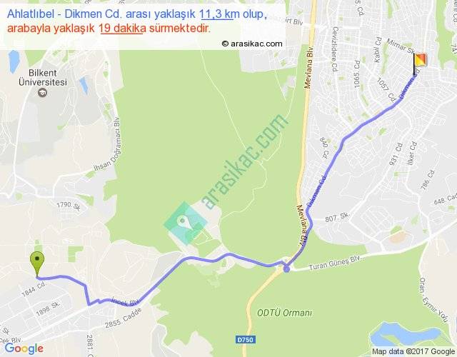 Ahlatlıbel - Dikmen Cd. arası yaklaşık olarak 90 km/h ile yukarıda belirtilen sürede olup, iki yerin kuş uçuşu uzaklığı (mesafesi) 9'dir. Yolculuk otobüsle 24 dakika sürmektedir.