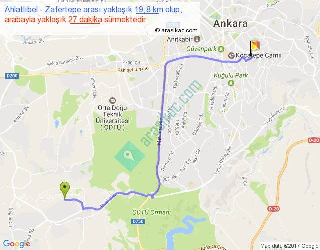 Ahlatlıbel - Zafertepe arası yaklaşık olarak 90 km/h ile yukarıda belirtilen sürede olup, iki yerin kuş uçuşu uzaklığı (mesafesi) 14'dir. Yolculuk otobüsle 35 dakika sürmektedir.