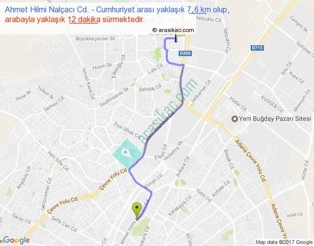 Ahmet Hilmi Nalçacı Cd. - Cumhuriyet arası yaklaşık olarak 90 km/h ile yukarıda belirtilen sürede olup, iki yerin kuş uçuşu uzaklığı (mesafesi) 6'dir. Yolculuk otobüsle 15 dakika sürmektedir.