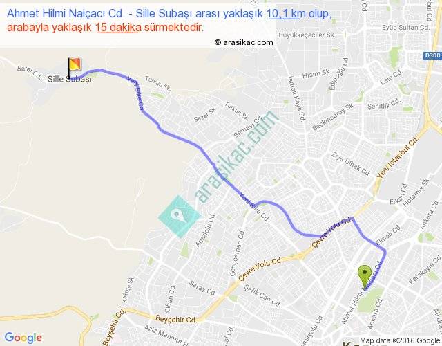 Ahmet Hilmi Nalçacı Cd. - Sille Subaşı arası yaklaşık olarak 90 km/h ile yukarıda belirtilen sürede olup, iki yerin kuş uçuşu uzaklığı (mesafesi) 8'dir. Yolculuk otobüsle 19 dakika sürmektedir.