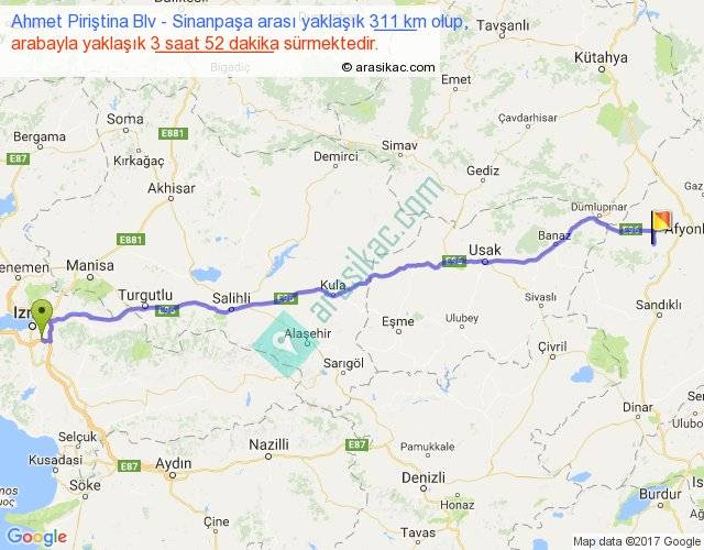 Ahmet Piriştina Blv - Sinanpaşa arası yaklaşık olarak 90 km/h ile yukarıda belirtilen sürede olup, iki yerin kuş uçuşu uzaklığı (mesafesi) 267'dir. Eğer belirtilen yerler arasında uçak seferi var ise bu süre uçakla 24 dakika'ya kadar düşebilir. Yolculuk otobüsle 5 saat 1 dakika sürmektedir.