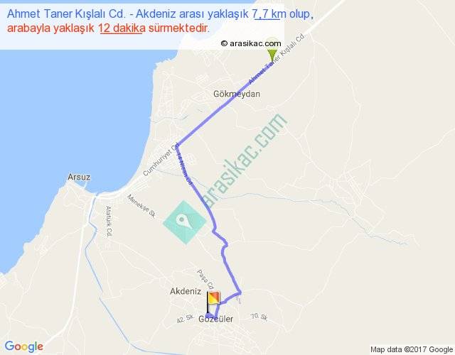 Ahmet Taner Kışlalı Cd. - Akdeniz arası yaklaşık olarak 90 km/h ile yukarıda belirtilen sürede olup, iki yerin kuş uçuşu uzaklığı (mesafesi) 6'dir. Yolculuk otobüsle 15 dakika sürmektedir.