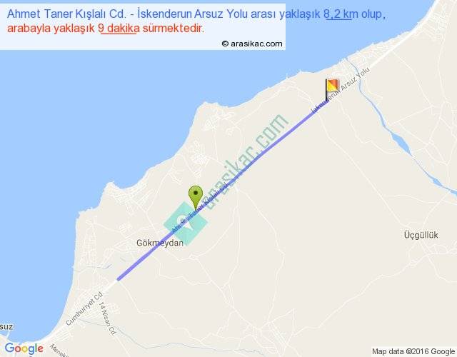 Ahmet Taner Kışlalı Cd. - İskenderun Arsuz Yolu arası yaklaşık olarak 90 km/h ile yukarıda belirtilen sürede olup, iki yerin kuş uçuşu uzaklığı (mesafesi) 4'dir. Yolculuk otobüsle 11 dakika sürmektedir.