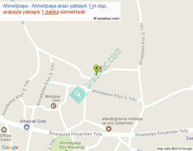 Ahmetpaşa - Ahmetpaşa arası yaklaşık olarak 90 km/h ile yukarıda belirtilen sürede olup, iki yerin kuş uçuşu uzaklığı (mesafesi) 0'dir. Yolculuk otobüsle 1 dakika sürmektedir.