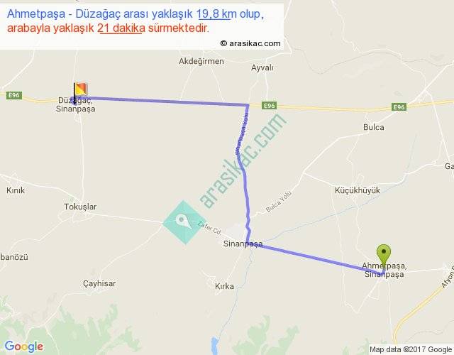Ahmetpaşa - Düzağaç arası yaklaşık olarak 90 km/h ile yukarıda belirtilen sürede olup, iki yerin kuş uçuşu uzaklığı (mesafesi) 15'dir. Yolculuk otobüsle 27 dakika sürmektedir.