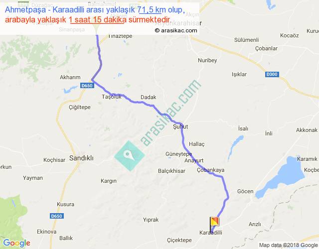 Ahmetpaşa - Karaadilli arası yaklaşık olarak 90 km/h ile yukarıda belirtilen sürede olup, iki yerin kuş uçuşu uzaklığı (mesafesi) 55'dir. Yolculuk otobüsle 1 saat 37 dakika sürmektedir.