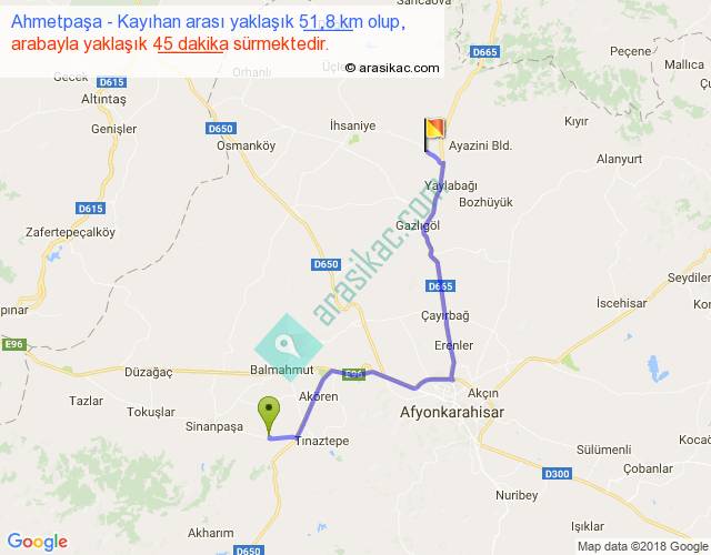 Ahmetpaşa - Kayıhan arası yaklaşık olarak 90 km/h ile yukarıda belirtilen sürede olup, iki yerin kuş uçuşu uzaklığı (mesafesi) 35'dir. Yolculuk otobüsle 58 dakika sürmektedir.