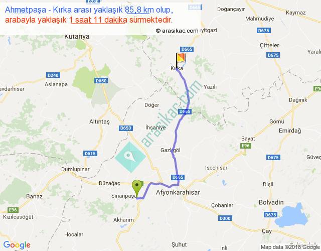 Ahmetpaşa - Kırka arası yaklaşık olarak 90 km/h ile yukarıda belirtilen sürede olup, iki yerin kuş uçuşu uzaklığı (mesafesi) 64'dir. Yolculuk otobüsle 1 saat 32 dakika sürmektedir.