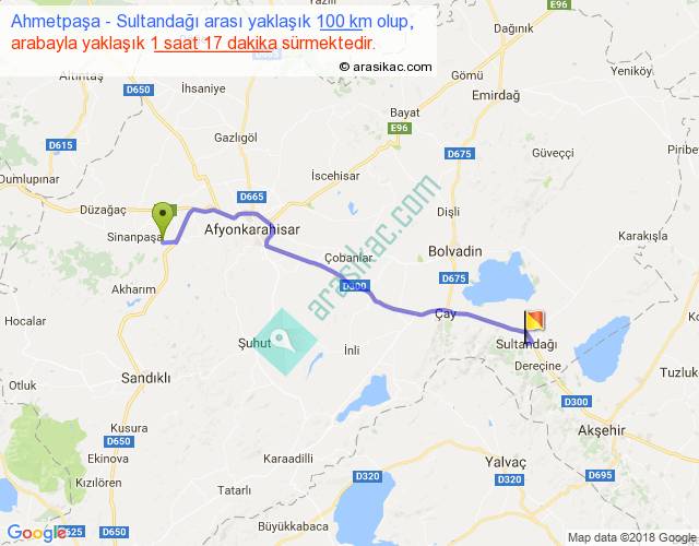 Ahmetpaşa - Sultandağı arası yaklaşık olarak 90 km/h ile yukarıda belirtilen sürede olup, iki yerin kuş uçuşu uzaklığı (mesafesi) 82'dir. Yolculuk otobüsle 1 saat 40 dakika sürmektedir.