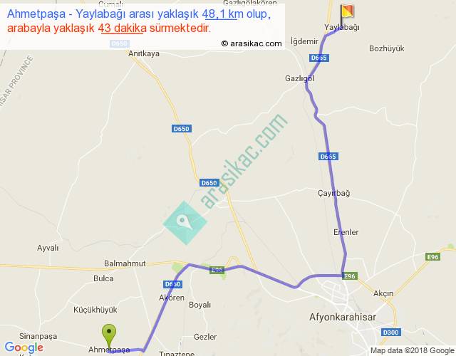Ahmetpaşa - Yaylabağı arası yaklaşık olarak 90 km/h ile yukarıda belirtilen sürede olup, iki yerin kuş uçuşu uzaklığı (mesafesi) 33'dir. Yolculuk otobüsle 55 dakika sürmektedir.
