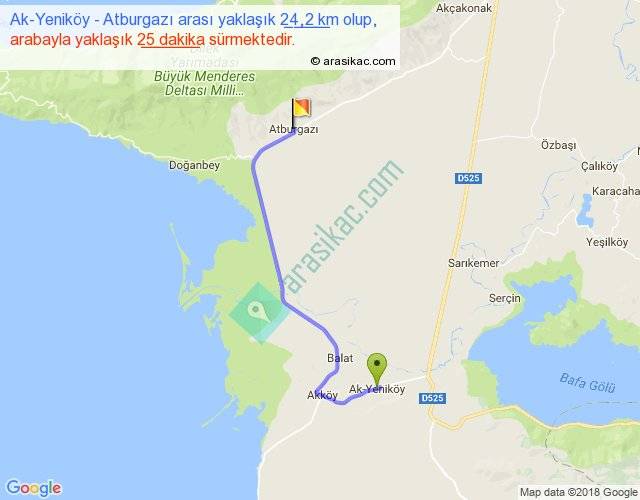 Ak-Yeniköy - Atburgazı arası yaklaşık olarak 90 km/h ile yukarıda belirtilen sürede olup, iki yerin kuş uçuşu uzaklığı (mesafesi) 16'dir. Yolculuk otobüsle 32 dakika sürmektedir.