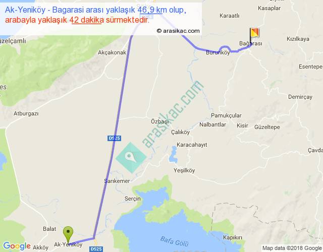 Ak-Yeniköy - Bagarasi arası yaklaşık olarak 90 km/h ile yukarıda belirtilen sürede olup, iki yerin kuş uçuşu uzaklığı (mesafesi) 32'dir. Yolculuk otobüsle 54 dakika sürmektedir.