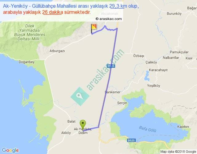 Ak-Yeniköy - Güllübahçe Mahallesi arası yaklaşık olarak 90 km/h ile yukarıda belirtilen sürede olup, iki yerin kuş uçuşu uzaklığı (mesafesi) 19'dir. Yolculuk otobüsle 33 dakika sürmektedir.