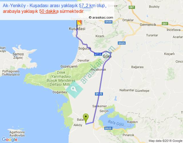 Ak-Yeniköy - Kuşadası arası yaklaşık olarak 90 km/h ile yukarıda belirtilen sürede olup, iki yerin kuş uçuşu uzaklığı (mesafesi) 40'dir. Yolculuk otobüsle 1 saat 5 dakika sürmektedir.