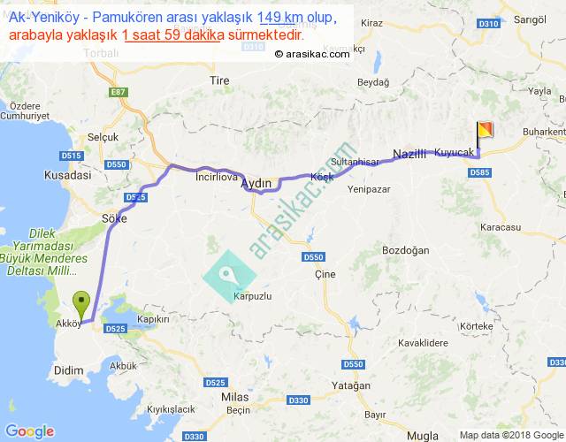 Ak-Yeniköy - Pamukören arası yaklaşık olarak 90 km/h ile yukarıda belirtilen sürede olup, iki yerin kuş uçuşu uzaklığı (mesafesi) 118'dir. Yolculuk otobüsle 2 saat 34 dakika sürmektedir.