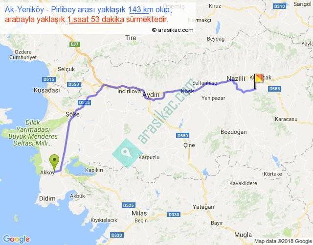 Ak-Yeniköy - Pirlibey arası yaklaşık olarak 90 km/h ile yukarıda belirtilen sürede olup, iki yerin kuş uçuşu uzaklığı (mesafesi) 107'dir. Yolculuk otobüsle 2 saat 26 dakika sürmektedir.