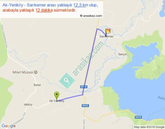 Ak-Yeniköy - Sarıkemer arası yaklaşık olarak 90 km/h ile yukarıda belirtilen sürede olup, iki yerin kuş uçuşu uzaklığı (mesafesi) 10'dir. Yolculuk otobüsle 15 dakika sürmektedir.