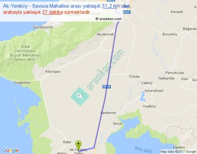 Ak-Yeniköy - Savuca Mahallesi arası yaklaşık olarak 90 km/h ile yukarıda belirtilen sürede olup, iki yerin kuş uçuşu uzaklığı (mesafesi) 28'dir. Yolculuk otobüsle 35 dakika sürmektedir.