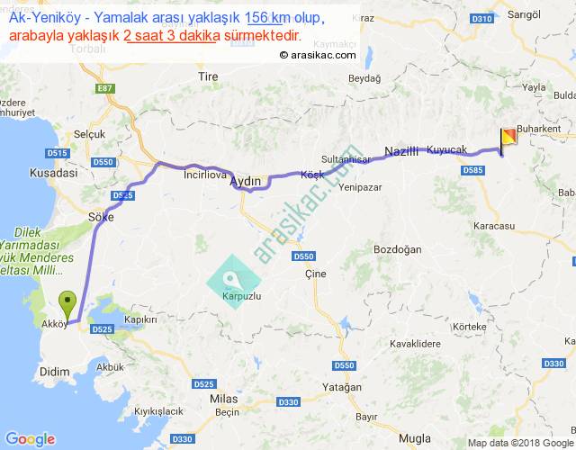 Ak-Yeniköy - Yamalak arası yaklaşık olarak 90 km/h ile yukarıda belirtilen sürede olup, iki yerin kuş uçuşu uzaklığı (mesafesi) 124'dir. Yolculuk otobüsle 2 saat 39 dakika sürmektedir.