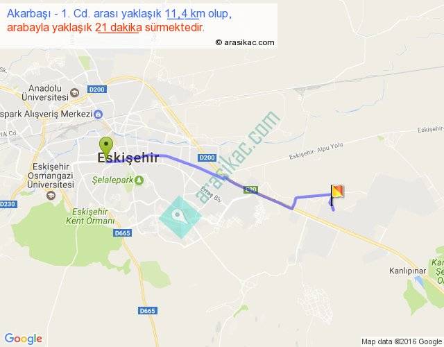 Akarbaşı - 1. Cd. arası yaklaşık olarak 90 km/h ile yukarıda belirtilen sürede olup, iki yerin kuş uçuşu uzaklığı (mesafesi) 10'dir. Yolculuk otobüsle 27 dakika sürmektedir.