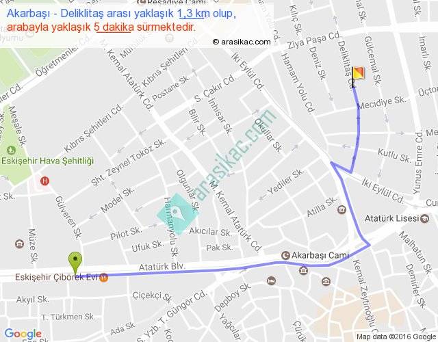 Akarbaşı - Deliklitaş arası yaklaşık olarak 90 km/h ile yukarıda belirtilen sürede olup, iki yerin kuş uçuşu uzaklığı (mesafesi) 1'dir. Yolculuk otobüsle 6 dakika sürmektedir.
