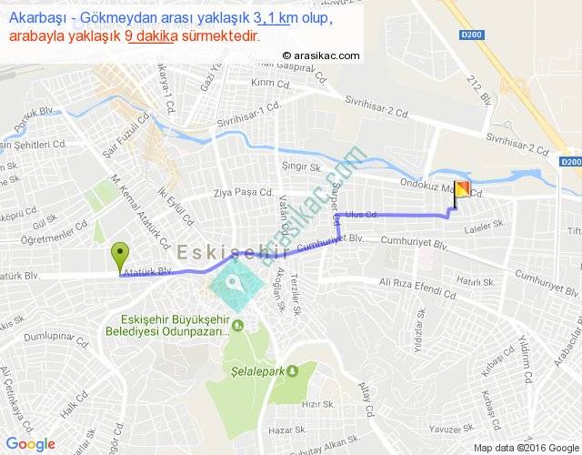 Akarbaşı - Gökmeydan arası yaklaşık olarak 90 km/h ile yukarıda belirtilen sürede olup, iki yerin kuş uçuşu uzaklığı (mesafesi) 3'dir. Yolculuk otobüsle 11 dakika sürmektedir.
