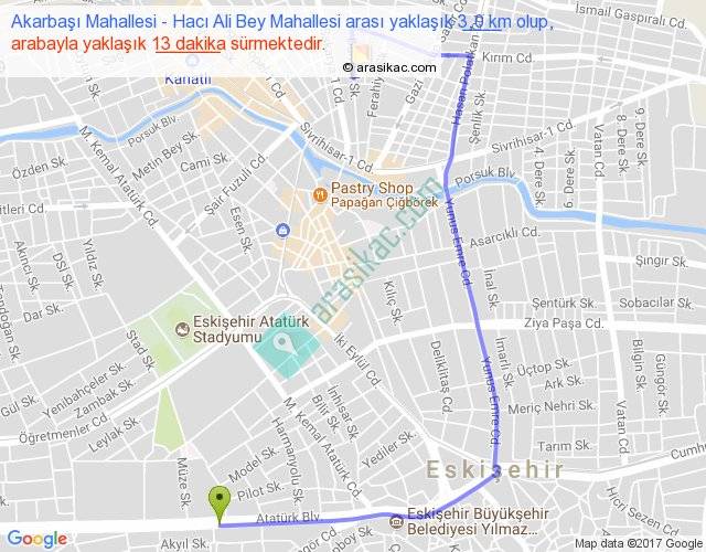 Akarbaşı Mahallesi - Hacı Ali Bey Mahallesi arası yaklaşık olarak 90 km/h ile yukarıda belirtilen sürede olup, iki yerin kuş uçuşu uzaklığı (mesafesi) 2'dir. Yolculuk otobüsle 16 dakika sürmektedir.