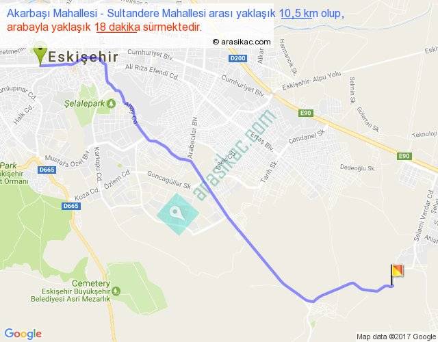 Akarbaşı Mahallesi - Sultandere Mahallesi arası yaklaşık olarak 90 km/h ile yukarıda belirtilen sürede olup, iki yerin kuş uçuşu uzaklığı (mesafesi) 9'dir. Yolculuk otobüsle 23 dakika sürmektedir.