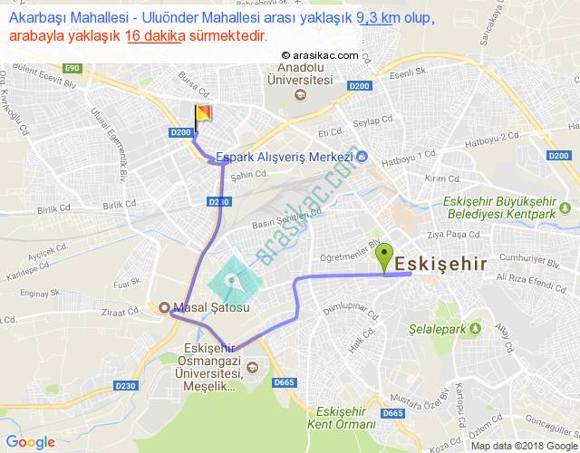 Akarbaşı Mahallesi - Uluönder Mahallesi arası yaklaşık olarak 90 km/h ile yukarıda belirtilen sürede olup, iki yerin kuş uçuşu uzaklığı (mesafesi) 4'dir. Yolculuk otobüsle 20 dakika sürmektedir.