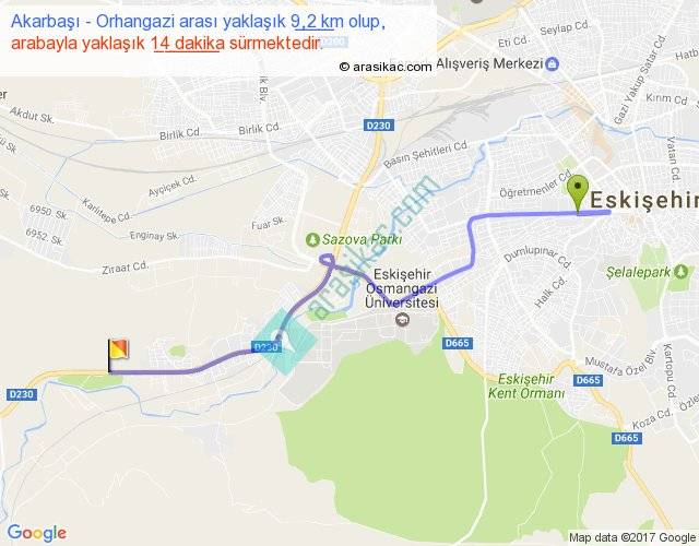 Akarbaşı - Orhangazi arası yaklaşık olarak 90 km/h ile yukarıda belirtilen sürede olup, iki yerin kuş uçuşu uzaklığı (mesafesi) 7'dir. Yolculuk otobüsle 18 dakika sürmektedir.