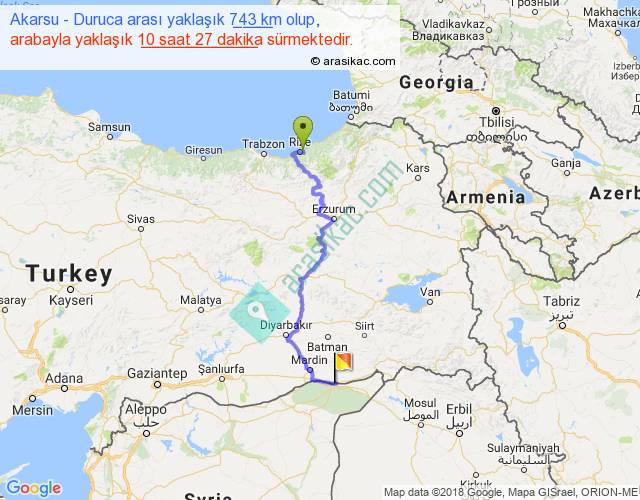 Akarsu - Duruca arası yaklaşık olarak 90 km/h ile yukarıda belirtilen sürede olup, iki yerin kuş uçuşu uzaklığı (mesafesi) 439'dir. Eğer belirtilen yerler arasında uçak seferi var ise bu süre uçakla 40 dakika'ya kadar düşebilir. Yolculuk otobüsle 13 saat 35 dakika sürmektedir.