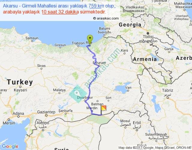 Akarsu - Girmeli Mahallesi arası yaklaşık olarak 90 km/h ile yukarıda belirtilen sürede olup, iki yerin kuş uçuşu uzaklığı (mesafesi) 437'dir. Eğer belirtilen yerler arasında uçak seferi var ise bu süre uçakla 40 dakika'ya kadar düşebilir. Yolculuk otobüsle 13 saat 41 dakika sürmektedir.