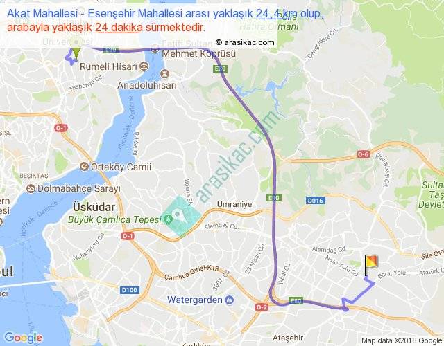 Akat Mahallesi - Esenşehir Mahallesi arası yaklaşık olarak 90 km/h ile yukarıda belirtilen sürede olup, iki yerin kuş uçuşu uzaklığı (mesafesi) 15'dir. Yolculuk otobüsle 31 dakika sürmektedir.