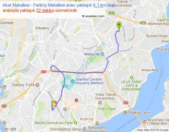 Eğer Akat Mahallesi Feriköy Mahallesi arası ne kadar yakar (benzin/mazot) diyorsanız, kilometrede 3 ₺ yakan bir aracınız var ise 27, km'de 4 ₺ yakan bir aracınız var ise 36, km'de 5 ₺ yakan bir aracınız var ise 45 ile bu yolculuğu tamamlayabilirsiniz.