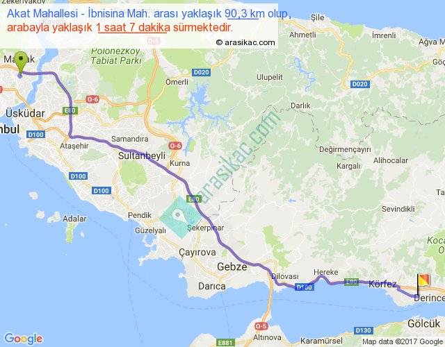 Akat Mahallesi - İbnisina Mah. arası yaklaşık olarak 90 km/h ile yukarıda belirtilen sürede olup, iki yerin kuş uçuşu uzaklığı (mesafesi) 75'dir. Yolculuk otobüsle 1 saat 27 dakika sürmektedir.