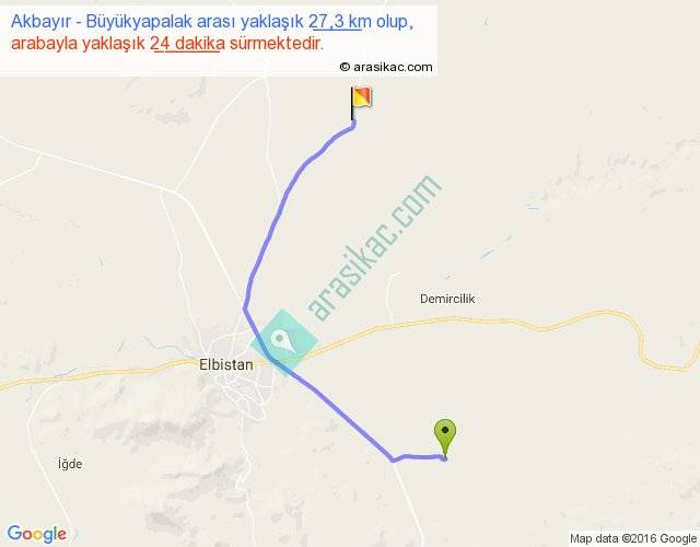 Akbayır - Büyükyapalak arası yaklaşık olarak 90 km/h ile yukarıda belirtilen sürede olup, iki yerin kuş uçuşu uzaklığı (mesafesi) 19'dir. Yolculuk otobüsle 31 dakika sürmektedir.
