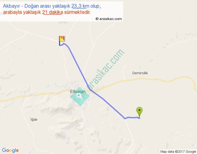 Akbayır - Doğan arası yaklaşık olarak 90 km/h ile yukarıda belirtilen sürede olup, iki yerin kuş uçuşu uzaklığı (mesafesi) 21'dir. Yolculuk otobüsle 27 dakika sürmektedir.