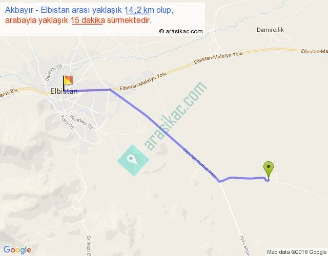 Akbayır - Elbistan arası yaklaşık olarak 90 km/h ile yukarıda belirtilen sürede olup, iki yerin kuş uçuşu uzaklığı (mesafesi) 13'dir. Yolculuk otobüsle 19 dakika sürmektedir.