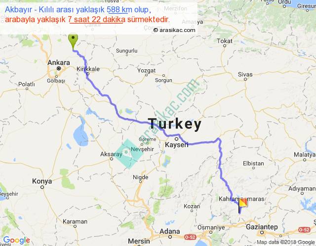 Akbayır - Kılılı arası yaklaşık olarak 90 km/h ile yukarıda belirtilen sürede olup, iki yerin kuş uçuşu uzaklığı (mesafesi) 446'dir. Eğer belirtilen yerler arasında uçak seferi var ise bu süre uçakla 41 dakika'ya kadar düşebilir. Yolculuk otobüsle 9 saat 34 dakika sürmektedir.